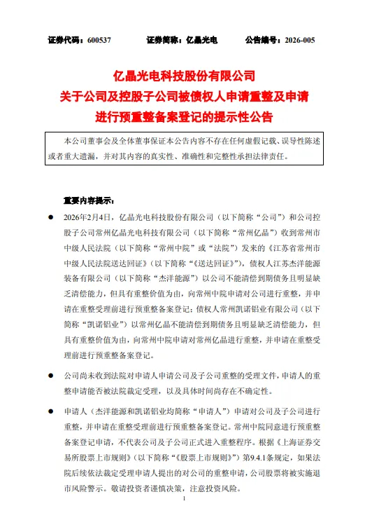 2月5日,亿晶光电公告称,公司及公司控股子公司常州亿晶光电科技有限公司(简称“常州亿晶”)收到常州市中级人民法院(简称“常州中院”)发来的《江苏省常州市中级人民法院送达回证》,债权人江苏杰洋能源装备有限公司(简称“杰洋能源”)以公司不能清偿到期债务且明显缺乏清偿能力,但具有重整价值为由,向常州中院申请对公司进行重整,并申请在重整受理前进行预重整备案登记。
