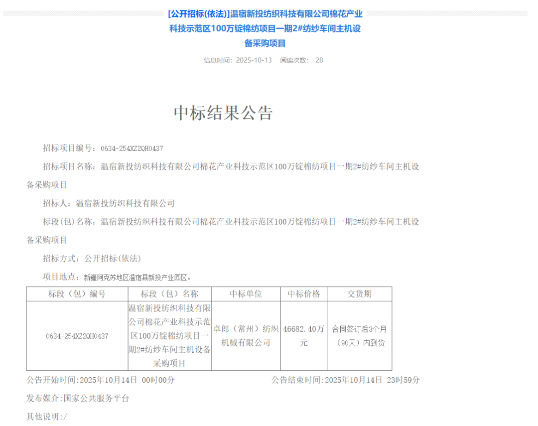 卓郎智能再获重大项目中标!继8月成功中标喀什新投100万锭纺纱项目(一期)一阶段主机设备采购项目后,于10月13日再度中标温宿新投纺织科技有限公司棉花产业科技示范区100万锭棉纺项目一期2#纺纱车间主机设备采购项目(项目编号:0634-254XZ2QH0437),中标金额 46,682.40万元。