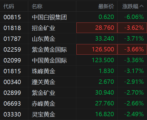 港股黄金股继续跌势,其中,中国白银集团大跌6%,招金矿业、山东黄金、紫金黄金国际跌近4%,其中山东黄金近8日累计跌幅超20%,中国黄金国际、珠峰黄金跌超3%,潼关黄金、紫金矿业、赤峰黄金、灵宝黄金均跌超2%。