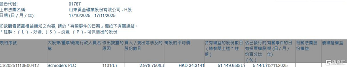 格隆汇11月17日丨根据联交所最新权益披露资料显示,2025年11月12日,山东黄金(01787.HK)获Schroders PLC在场内以每股均价34.3141港元增持297.88万股,涉资约1.02亿港元。