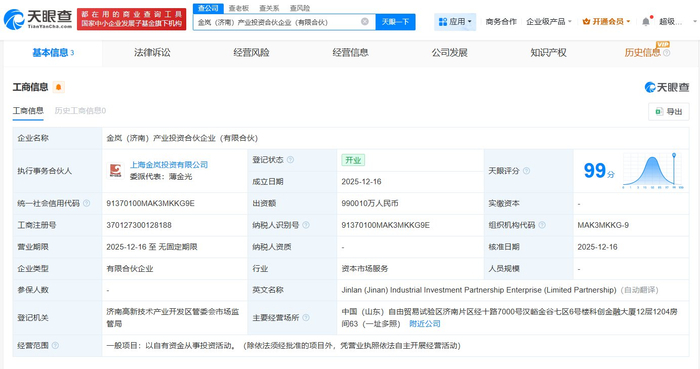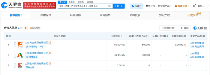雷达财经讯,天眼查工商信息显示,近日,金岚(济南)产业投资合伙企业(有限合伙)成立,执行事务合伙人为上海金岚投资有限公司,出资额约99亿人民币,经营范围为以自有资金从事投资活动。合伙人信息显示,该合伙企业由山东黄金集团有限公司、山东高速集团有限公司、上海金岚投资有限公司共同出资。