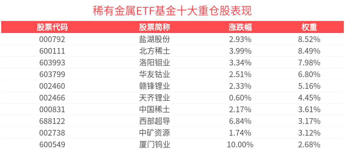 数据显示,截至2025年9月30日,中证稀有金属主题指数(930632)前十大权重股分别为北方稀土(600111)、洛阳钼业(603993)、华友钴业(603799)、盐湖股份(000792)、赣锋锂业(002460)、天齐锂业(002466)、中国稀土(000831)、中矿资源(002738)、盛和资源(600392)、西部超导(688122),前十大权重股合计占比59.91%。
