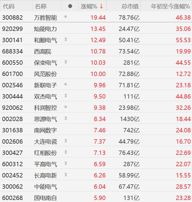 格隆汇1月16日|A股市场智能电网概念股今日继续强势,其中,万胜智能逼近20CM涨停,灿能电力涨超13%,和顺电气涨超12%,西高院涨近11%,保变电气、新联电子10CM 2连板,风范股份10CM涨停,双杰电气、科润智控涨超9%,思源电气涨超8%,南网数字、大连电瓷、红相股份涨超7%,平高电气、长高电新、中能电气涨超6%。