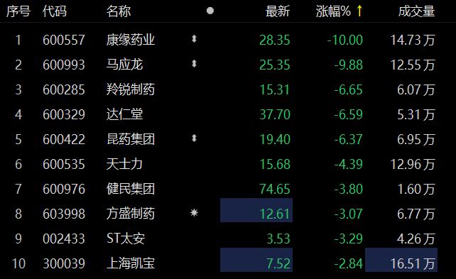 上证报中国证券网讯 4月10日,中药板块集体走低,截至10:23,康缘药业跌停,马应龙逼近跌停,昆药集团、羚锐制药、天士力等跌幅居前。