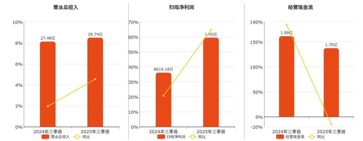 公司营业总收入为28.74亿元,在已披露的同业公司中排名第10,较去年同报告期营业总收入增加1.25亿元,实现3年连续上涨,同比较去年同期上涨4.55%。归母净利润为1.42亿元,在已披露的同业公司中排名第36,较去年同报告期归母净利润增加5582.74万元,实现3年连续上涨,同比较去年同期上涨64.77%。经营活动现金净流入为1.70亿元,在已披露的同业公司中排名第23。