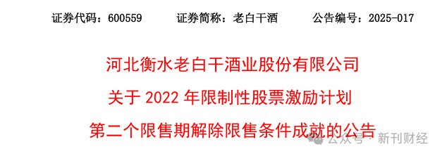 老白干酒曾于5月21日公告,公司2022年股权激励计划第二个限售期解除限售条件已满足。本次涉及207名激励对象,可解除限售股票数量为523.8万股,占授予总量的30%。根据计划安排,第二个限售期自2022年6月7日(首次授予登记日)起36个月后届满,即2025年6月6日到期,符合条件的激励对象可在届满后申请解除限售。
