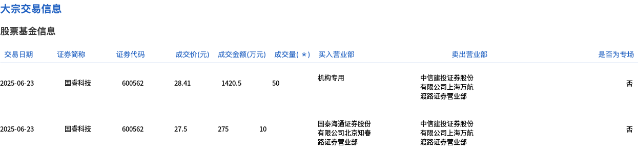 6月23日,国睿科技大宗交易成交60万股,成交额1695.5万元,占当日总成交额的2.95%,成交均价28.26元,较市场收盘价28.76元折价1.74%,其中最高成交价28.41元,最低成交价27.5元。