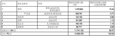 3、本期员工持股计划持有人的范围为公司董事(不含独立董事)、监事、高级管理人员以及公司董事会认为应当激励的重要员工。所有持有人均在公司或其全资子公司任职,与公司或其全资子公司具有劳动合同关系。参加本期员工持股计划的员工总人数不超过70人,其中董事、监事、高级管理人员共计6人。公司董事会授权由本员工持股计划持有人会议推选的管理委员会根据员工变动情况、考核情况,对参与本计划的员工名单和分配比例进行调整。