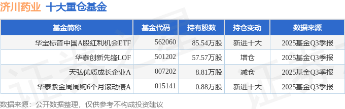 持有济川药业最多的基金为华宝标普中国A股红利机会ETF,目前规模为15.81亿元,最新净值0.5948(10月28日),较上一交易日下跌0.39%,近一年上涨14.86%。该基金现任基金经理为胡洁 胡一江。