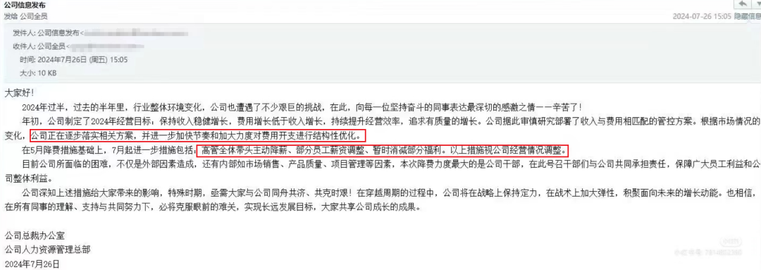 全体员工信。7月份措施:高管全体带头主动降新、部分员工新资调整、暂时消减部分福利