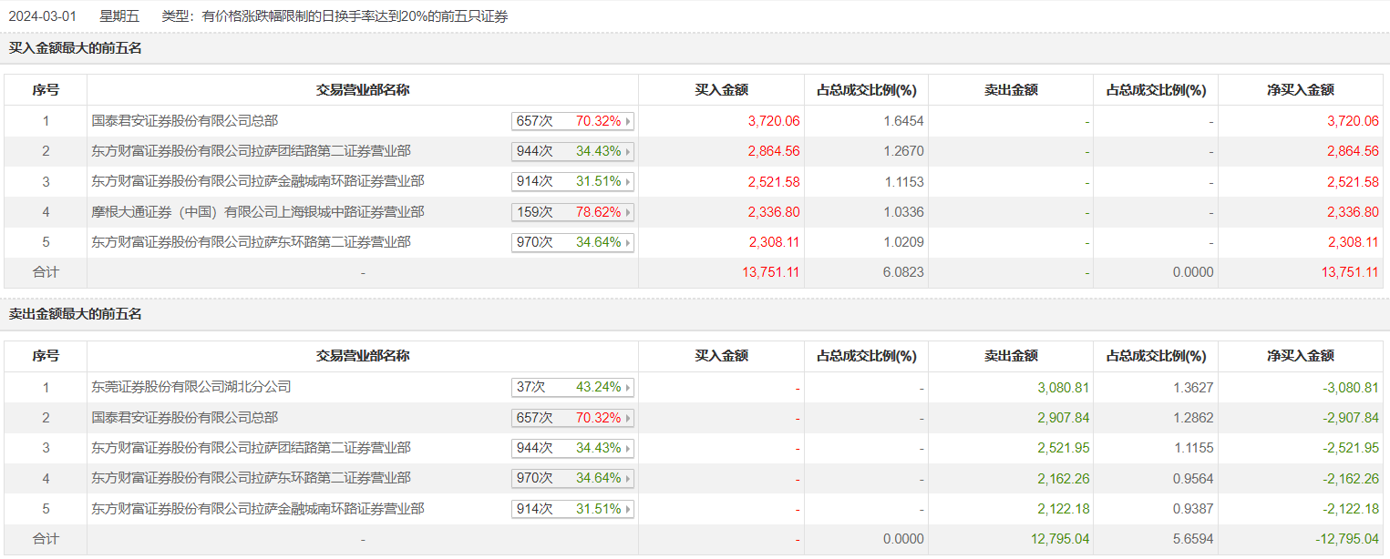 具体来看,东莞证券湖北分公司、国泰君安证券总部分别卖出3080.81万元、2907.84万元;国泰君安证券总部、东方财富证券拉萨团结路第二证券营业部分别买入3720.06万元、2864.56万元。
