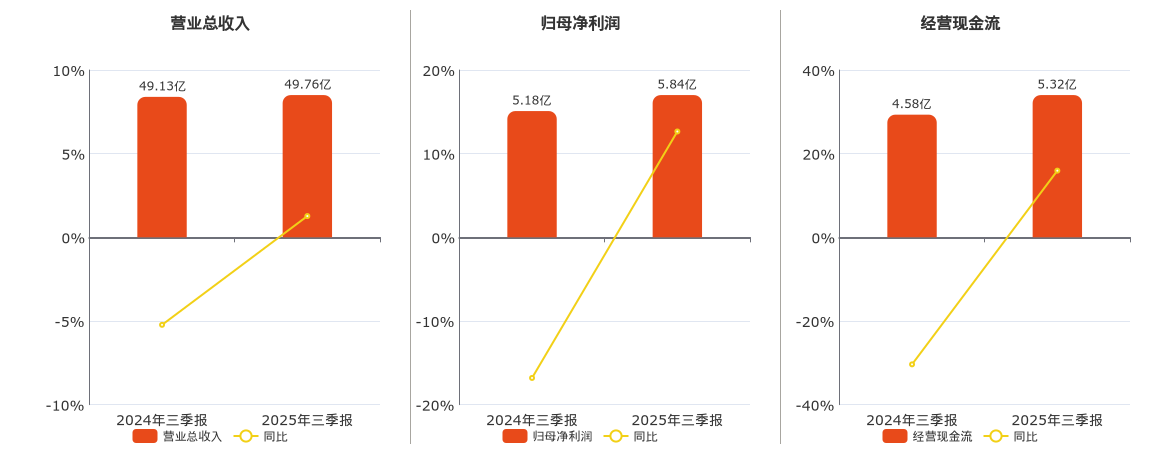 公司营业总收入为49.76亿元,在已披露的同业公司中排名第7,较去年同报告期营业总收入增加6257.30万元,同比较去年同期上涨1.27%。归母净利润为5.84亿元,在已披露的同业公司中排名第9,较去年同报告期归母净利润增加6557.71万元,同比较去年同期上涨12.65%。经营活动现金净流入为5.32亿元,在已披露的同业公司中排名第9,较去年同报告期经营活动现金净流入增加7307.95万元,同比较去年同期上涨15.94%。