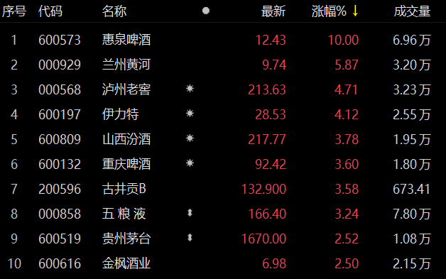 饮料制造板块异动拉升 惠泉啤酒涨停