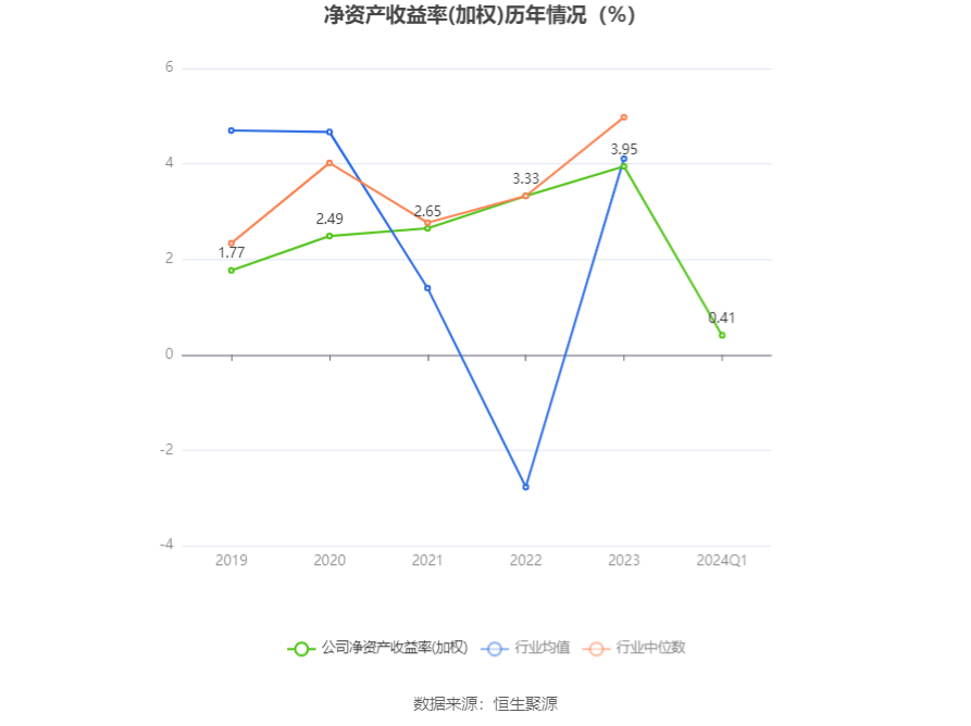 数据显示,2024年第一季度公司加权平均净资产收益率为0.41%,较上年同期增长0.34个百分点;公司2024年第一季度投入资本回报率为-0.12%,较上年同期增长0.21个百分点。