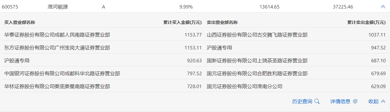 5月30日,淮河能源今日涨停,龙虎榜数据显示,上榜营业部席位全天成交8733.54万元,占当日总成交金额比例为23.46%。其中,买入金额为4753.02万元,卖出金额为3980.52万元,合计净买入772.5万元。