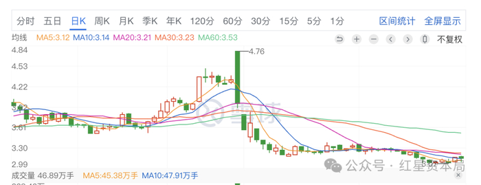 红星资本局查询发现,淮河能源在2024年12月31日复牌,股价高开后迅速回落暴跌,10个交易日内,股价从4.76元滑落至3.2元,下跌超30%。