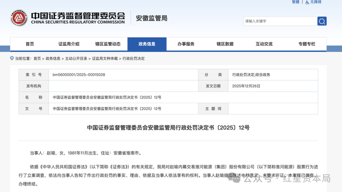 红星资本局12月27日消息,12月26日,中国证券监督管理委员会安徽监管局连发三份行政处罚决定书,对涉及内幕交易淮河能源(600575.SH)的赵瑜、刘强、马进华三人进行处罚。