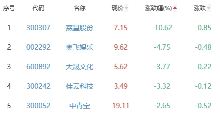 慈星股份、奥飞娱乐、大晟文化、佳云科技、中青宝位列涨幅榜后五位,涨幅分别为-10.62%、-4.75%、-3.77%、-3.32%、-2.65%。