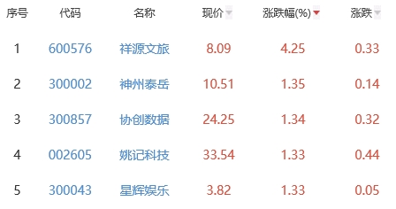 其中,祥源文旅、神州泰岳、协创数据、姚记科技、星辉娱乐位列板块涨幅前五位,涨幅分别为4.25%、1.35%、1.34%、1.33%、1.33%。