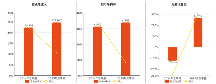公司营业总收入为177.76亿元。归母净利润为4.51亿元。经营活动现金净流入为14.26亿元。