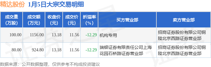 1月5日精达股份现2笔折价12.29%的大宗交易 合计成交2080.8万元