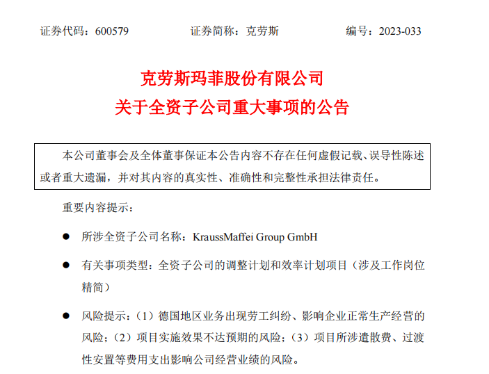 5月23日,克劳斯公告披露,公司间接持股的全资子公司KM集团2022年度和2023年第一季度持续亏损。为进一步降低运营成本,KM集团拟实施以组织结构优化、组织流程优化、工作岗位精简、降本提质增效为核心的调整计划和效率计划项目。