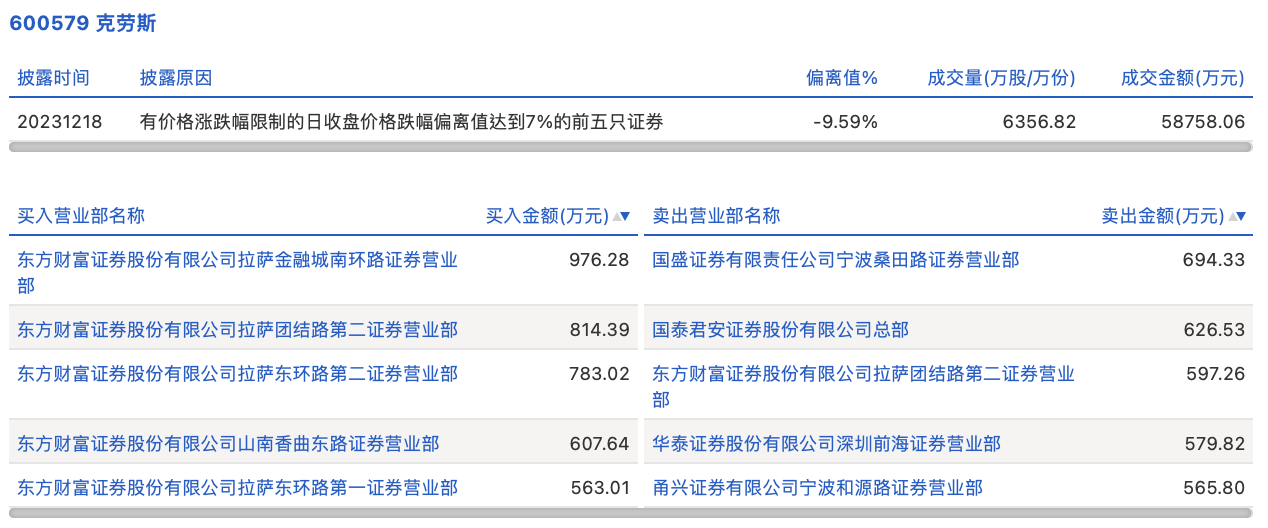 12月18日,克劳斯今日跌停,龙虎榜数据显示,上榜营业部席位全天成交6808.1万元,占当日总成交金额比例为11.59%。其中,买入金额为3744.35万元,卖出金额为3063.75万元,合计净买入680.6万元。