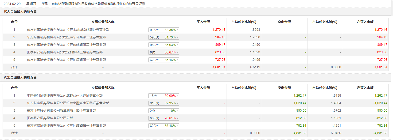具体来看,中国银河证券成都益州大道证券营业部、东方财富证券拉萨金融城南环路证券营业部分别卖出1262.17万元、1020.44万元;东方财富证券拉萨金融城南环路证券营业部、东方财富证券拉萨东环路第一证券营业部分别买入1270.16万元、904.49万元。