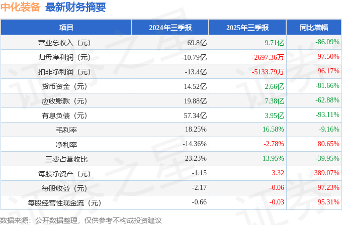据证券之星公开数据整理,近期中化装备(600579)发布2025年三季报。根据财报显示,中化装备亏损收窄。截至本报告期末,公司营业总收入9.71亿元,同比下降86.09%,归母净利润-2697.36万元,同比上升97.5%。按单季度数据看,第三季度营业总收入3.13亿元,同比下降87.36%,第三季度归母净利润-859.77万元,同比上升98.91%。