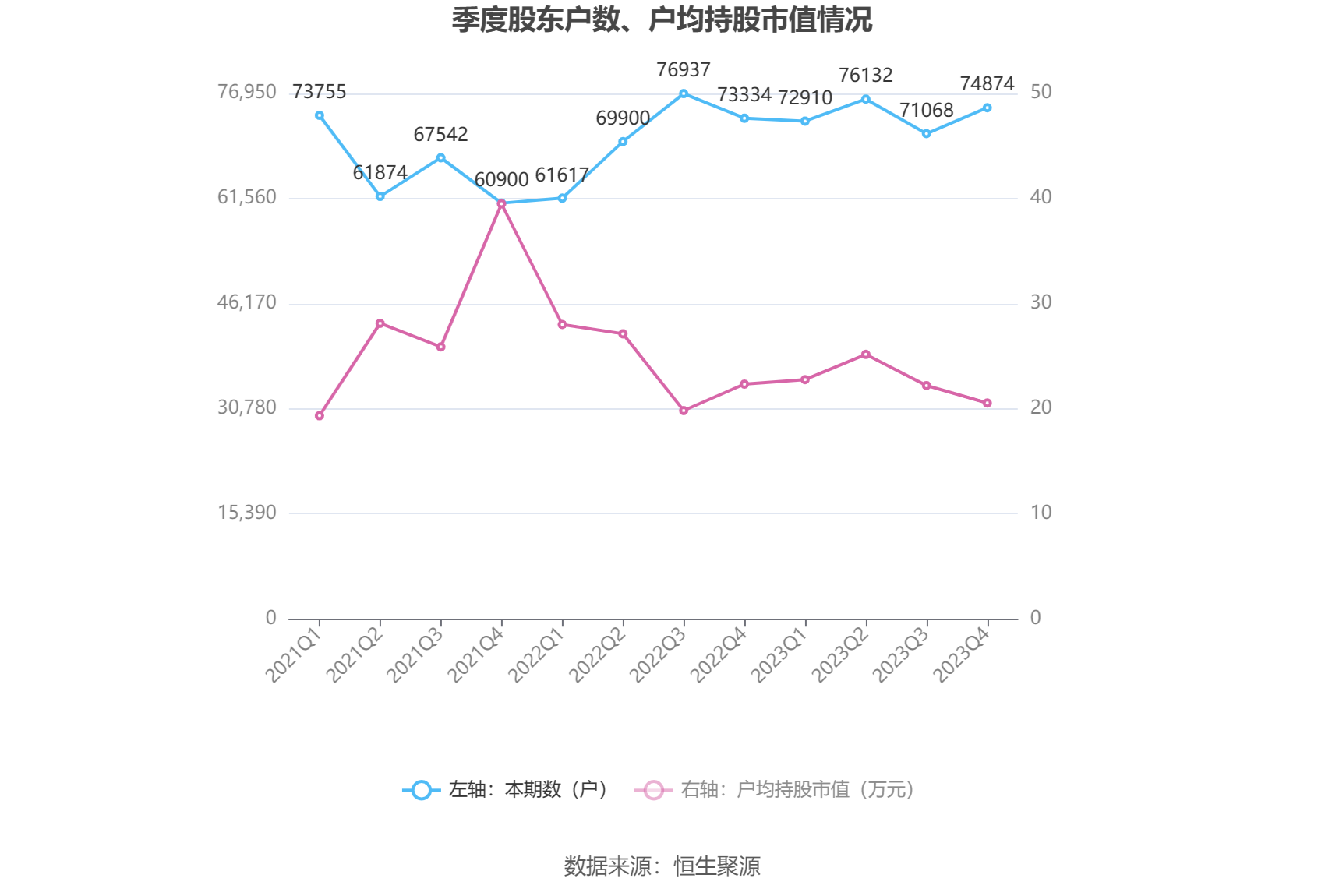 筹码集中度方面,截至2023年年末,公司股东总户数为7.49万户,较三季度末增长了3806户,增幅5.36%;户均持股市值由三季度末的22.20万元下降至20.54万元,降幅为7.48%。