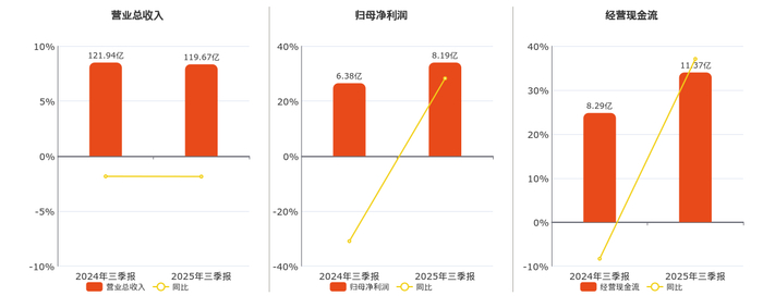 公司营业总收入为119.67亿元,较去年同报告期营业总收入减少2.27亿元,同比较去年同期下降1.86%。归母净利润为8.19亿元。经营活动现金净流入为11.37亿元。