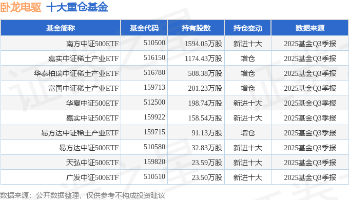 持有卧龙电驱最多的基金为南方中证500ETF,目前规模为400.98亿元,最新净值7.5881(10月29日),较上一交易日上涨1.91%,近一年上涨26.54%。该基金现任基金经理为罗文杰。