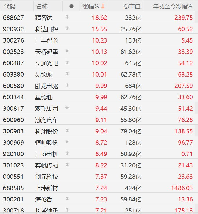格隆汇12月22日|A股机器人概念全线上涨,精智达涨超18%,科达自控涨超15%,三丰智能涨超10%,天桥起重、亨通光电、易德龙、卧龙电驱、星德胜10CM涨停,双飞集团、渤海汽车、科翔股份涨超9%,恒帅股份、三协电机、奕帆传动涨超8%,创元科技、上纬新材、海伦哲、长盛铀承涨超7%。