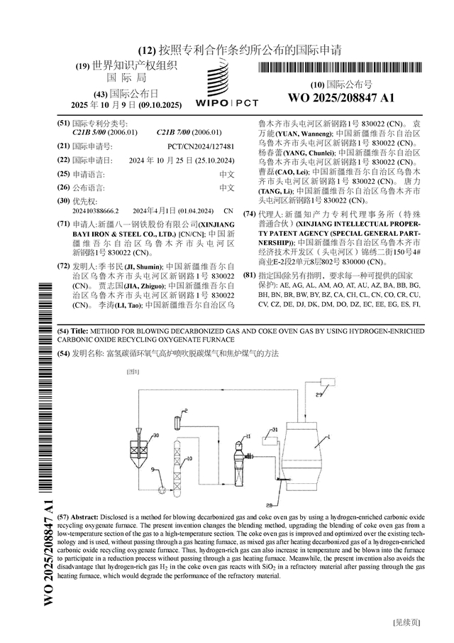八一钢铁公布国际专利申请:“富氢碳循环氧气高炉喷吹脱碳煤气和焦炉煤气的方法”