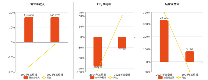 公司营业总收入为146.17亿元。归母净利润为-5.72亿元,较去年同报告期归母净利润增加8.73亿元。经营活动现金净流入为5.17亿元。