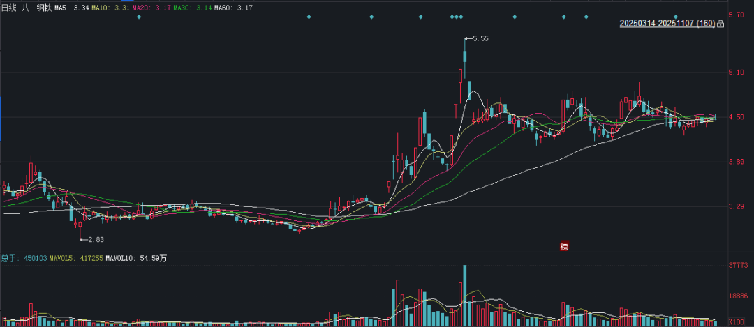 二级市场上,截至11月7日收盘,八一钢铁下跌0.67%报4.45元/股,总市值约68.21亿元,今年来公司股价累计上涨约45%。