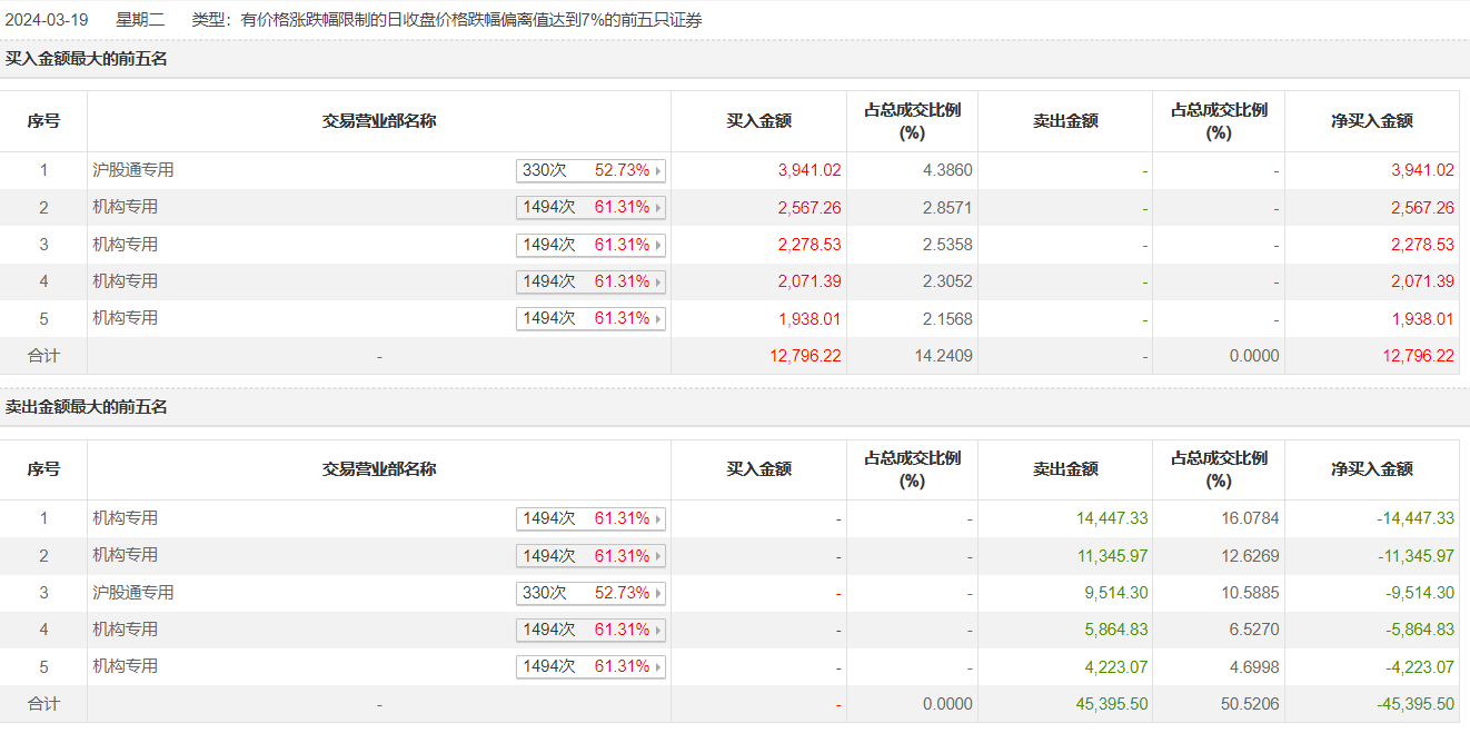 海油工程3月19日跌10.04%,成交额8.99亿元,换手率3.17%,盘后龙虎榜数据显示,沪股通专用席位买入3941.02万元并卖出9514.30万元,四机构净买入8855.20万元,四机构净卖出3.59亿元。
