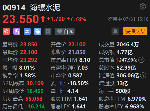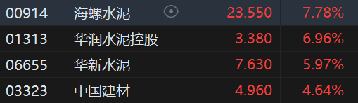 港股建材股表现强势,海螺水泥涨幅逼近8%,华润水泥涨幅逼近7%,华新水泥、中国建材等跟涨。