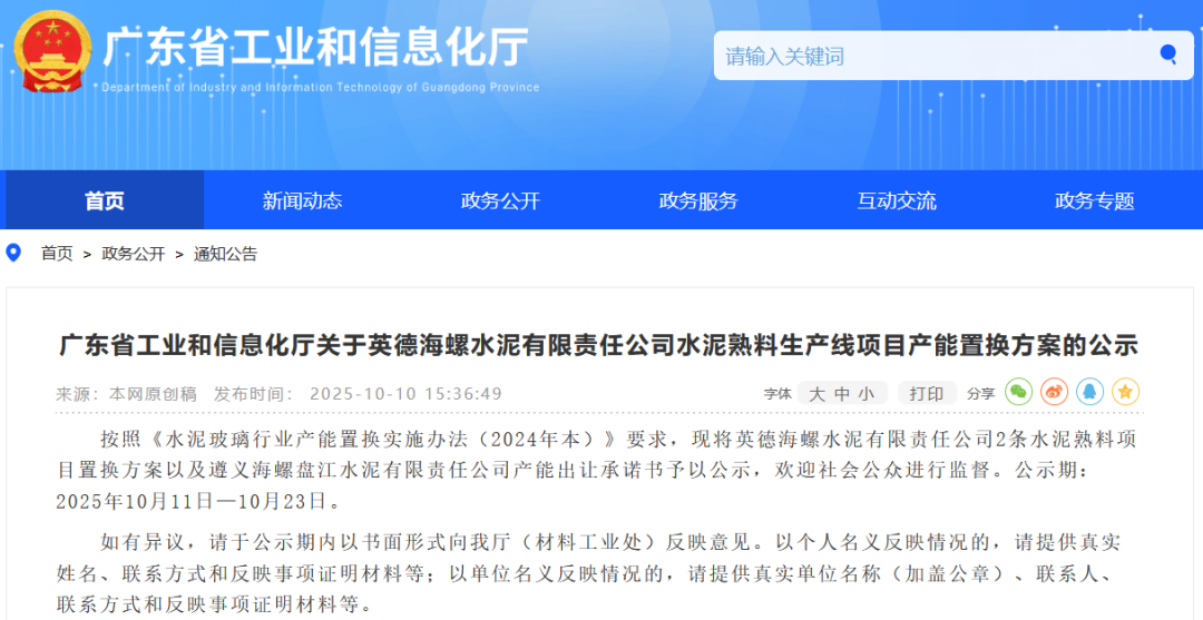 近日,广东省工信厅发布“关于英德海螺水泥有限责任公司水泥熟料生产线项目产能置换方案的公示”。
