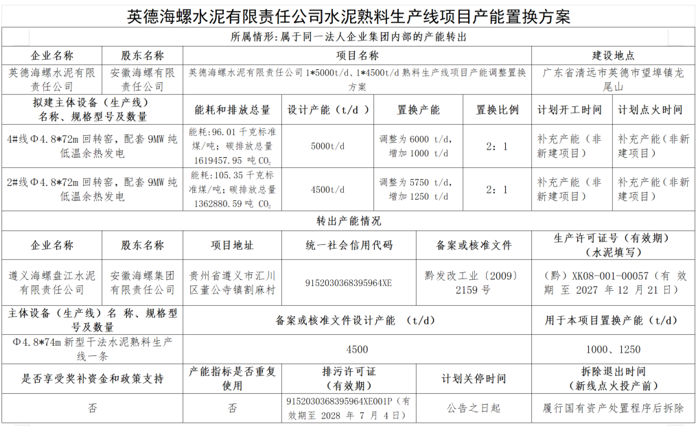 产能置换方案显示,英德海螺水泥4#线5000t/d熟料生产线补充产能1000t/d,2#线4500t/d熟料生产线补充产能1250t/d,出让产能来自遵义海螺盘江水泥,置换比例2:1。