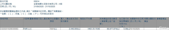 格隆汇10月21日丨根据联交所最新权益披露资料显示,2025年10月15日,海螺水泥(00914.HK)获FMR LLC在场内以每股均价25.7036港元增持244.6万股,涉资约6287.1万港元。
