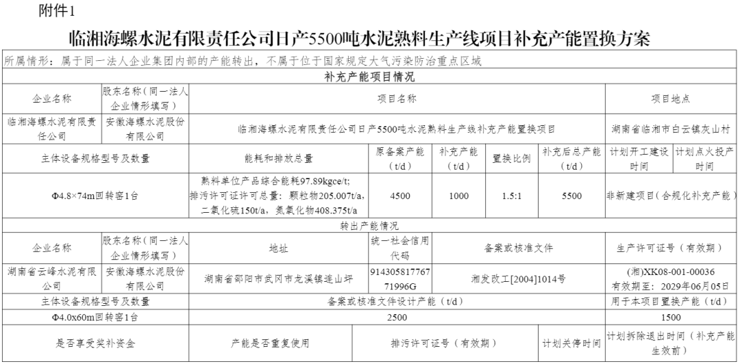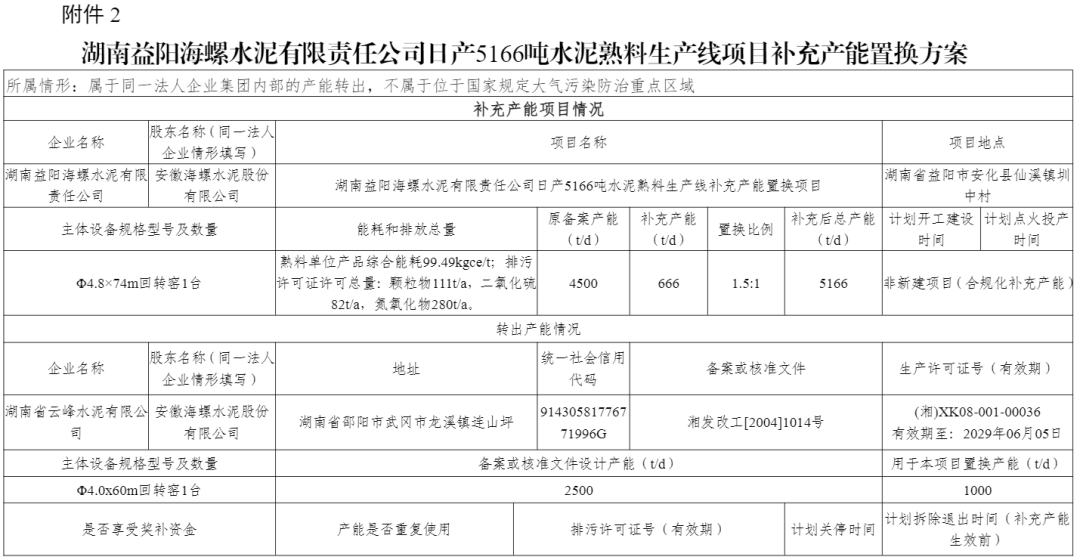 置换方案显示,湖南省云峰水泥有限公司出让一条2500t/d熟料生产线产能,其中1500t/d产能用于补充临湘海螺水泥4500t/d熟料线,补充后产能5500t/d,1000t/d产能用于补充益阳海螺水泥4500t/d熟料线,补充后产能5166t/d,置换比例1.5:1。