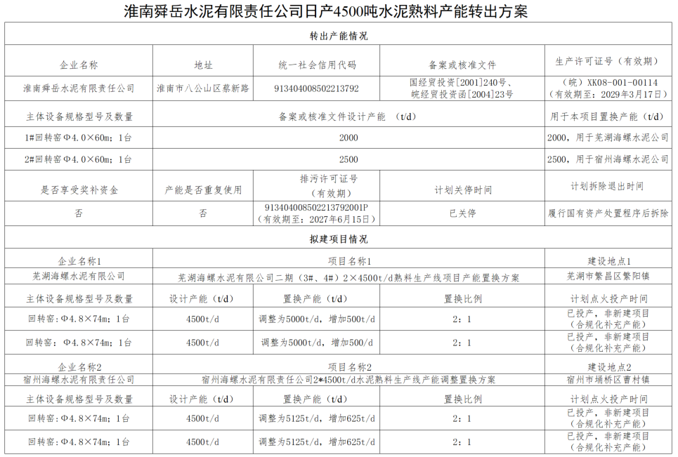 置换方案显示,淮南舜岳水泥4500t/d熟料产能全部用于海螺水泥项目,其中2000t/d用于芜湖海螺,2500t/d用于宿州海螺,置换比例2:1。