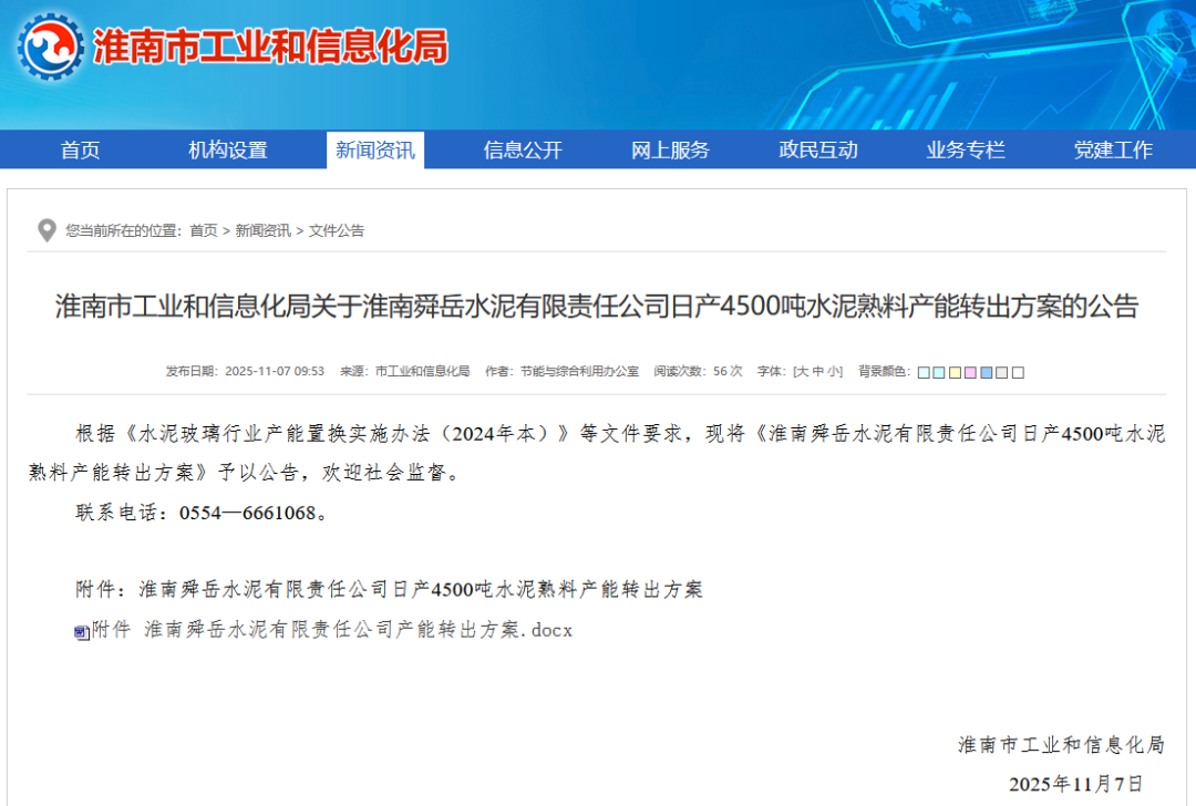 11月7日,安徽省淮南市工信局发布“关于淮南舜岳水泥有限责任公司日产4500吨水泥熟料产能转出方案的公告”。