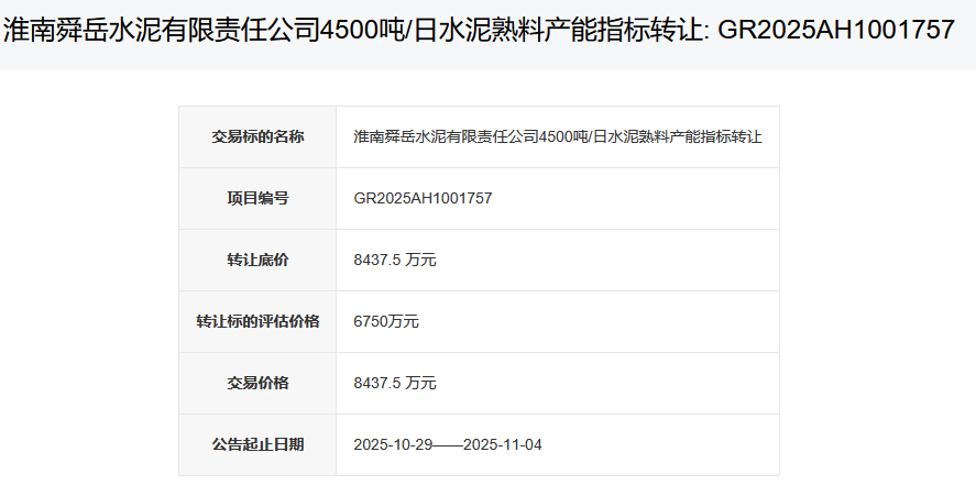 9月,淮南舜岳水泥有限责任公司挂牌转让4500t/d水泥熟料产能指标,底价为8437.5万元。