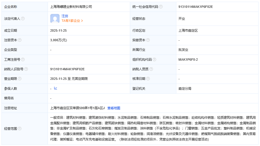 近日,上海海螺建业新材料有限公司成立,法定代表人为汪剑,注册资本3000万人民币,经营范围含建筑材料销售、建筑装饰材料销售、水泥制品销售、石棉制品销售、石棉水泥制品销售、砼结构构件销售、轻质建筑材料销售等。