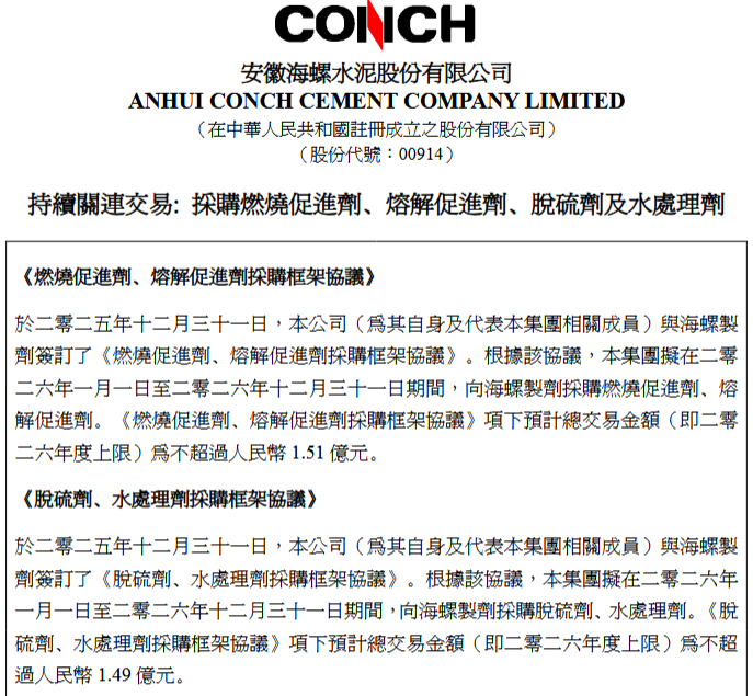 2025年12月31日,海螺水泥发布公告称,公司当日为其自身及代表集团相关成员,与海螺制剂分别签订《燃烧促进剂、熔解促进剂采购框架协议》和《脱硫剂、水处理剂采购框架协议》,拟于2026年1月1日至2026年 12 月31日期间,向海螺制剂采购对应品类产品,其中前者2026年度交易金额上限不超过人民币1.51亿元,后者不超过人民币1.49亿元。
