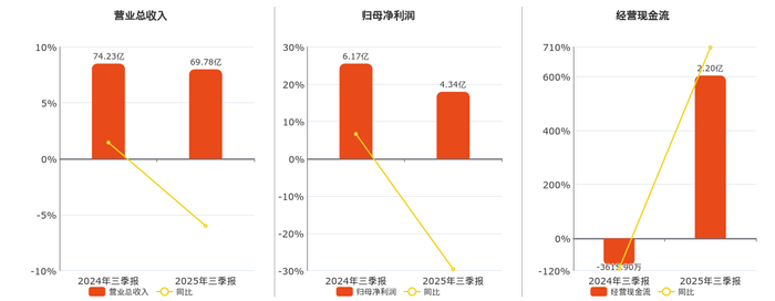 公司营业总收入为69.78亿元,在已披露的同业公司中排名第4,较去年同报告期营业总收入减少4.45亿元,同比较去年同期下降6.00%。归母净利润为4.34亿元,在已披露的同业公司中排名第15,较去年同报告期归母净利润减少1.83亿元,同比较去年同期下降29.61%。经营活动现金净流入为2.20亿元,在已披露的同业公司中排名第33,较去年同报告期经营活动现金净流入增加2.56亿元。