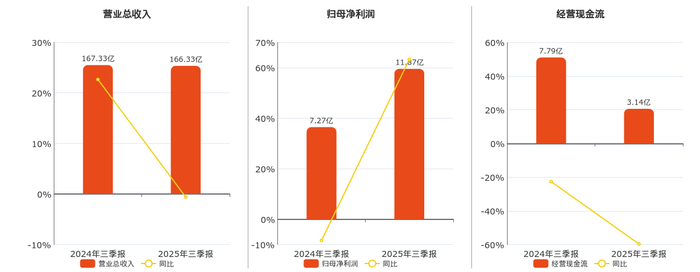 公司营业总收入为166.33亿元,较去年同报告期营业总收入减少1.00亿元,同比较去年同期下降0.60%。归母净利润为11.87亿元。经营活动现金净流入为3.14亿元,较去年同报告期经营活动现金净流入减少4.65亿元,同比较去年同期下降59.69%。