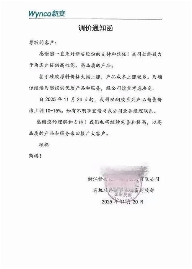 11月20日,硅酮胶市场掀起涨价热潮,多家龙头企业相继发布正式涨价函。新安股份(600596.SH)调价通知函表示:“鉴于硅胶原料价格大幅上涨,产品成本上涨较多,为确保继续为您提供优质产品和服务,自2025年11月24日起,公司硅酮胶系列产品销售价格上调10-15%。”此外,硅宝科技、集泰股份也分别发布调价函,对部分产品提价10%-20%。
